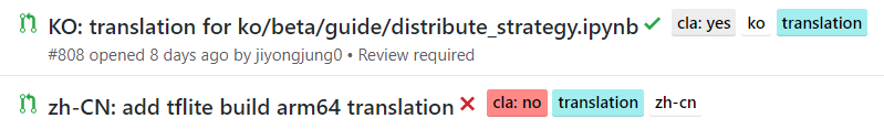 내가 수정한 내용을 Merge해달라는 Pull Request를 보내기 전에 기존 Pull Request 목록을 확인해보면 요청이 거부된 사례들이 있다. tensorflow/docs를 보면 CLA로 인해 거부되는 경우가 많이 보인다.