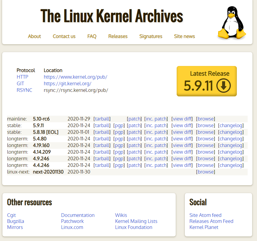 Latest Release 버튼을 클릭하면 현재 최신 버전인 5.9.11 (파일명: linux-5.9.11.tar.xz)을 다운받아서 사용할 수 있습니다.