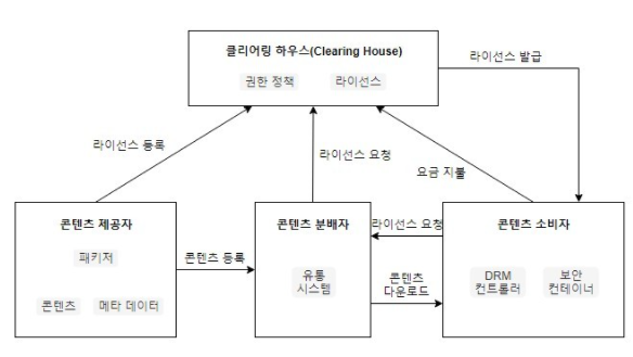 시험에서 DRM이 너무 많이 나와서 좀 더 구체적으로 낸다면 클리어링 하우스 (Clearing House)를 낼 수 있을 것 같습니다. 클리어링 하우스는 디지털 저작권 라이선스의 중개 및 발급을 수행하는 곳입니다. 아래 그림은 아직 시험에 나온 적이 없어서 중요하진 않은데 혹시 전체 흐름을 눈으로 보고 싶다면 도움이 되실 것 같습니다.