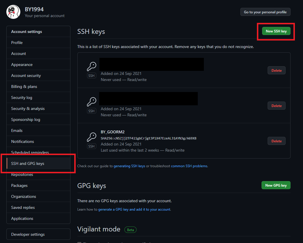 그리고 왼쪽 화면에 SSH and GPG keys를 눌러 들어오고, 오른쪽 위에 초록색 버튼인 New SSH key를 누른다.