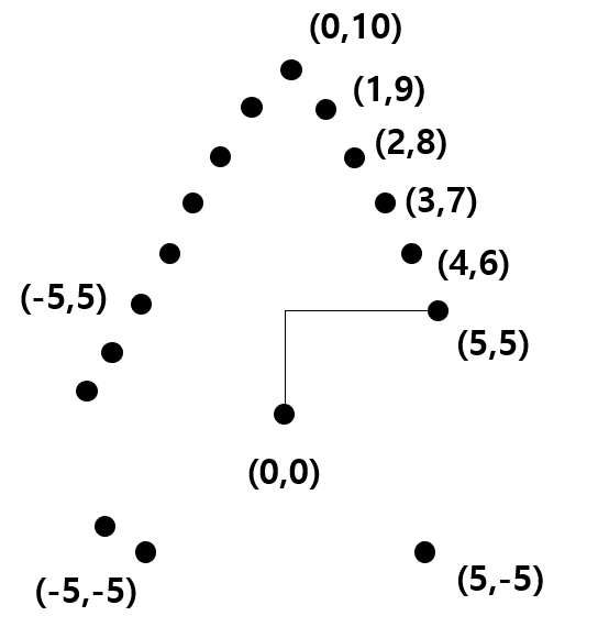예를 들어, 중간 지점인 (x1,y1) = (0,0)을 기준으로 삼고, 길이가 10이라면 아래와 같은 점들이 모두 길이가 10이 나온다는 것을 알 수 있습니다.