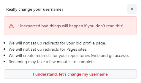 4. 해당 내용을 꼼꼼히 본 후에 'I understand, let's change my username' 을 클릭하면 새 username 을 작성할 수 있습니다.