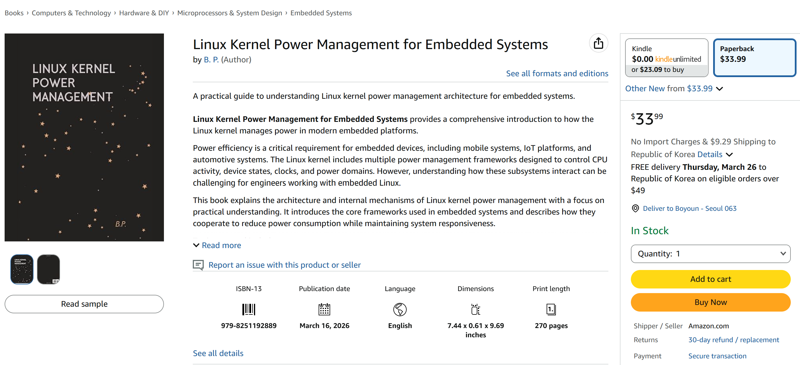 Linux Kernel Power Management for Embedded Systems provides a comprehensive introduction to how the Linux kernel manages power in modern embedded platforms.Power efficiency is a critical requirement for embedded devices, including mobile systems, IoT platforms, and automotive systems. The Linux kernel includes multiple power management frameworks designed to control CPU activity, device states, clocks, and power domains. However, understanding how these subsystems interact can be challenging for engineers working with embedded Linux.